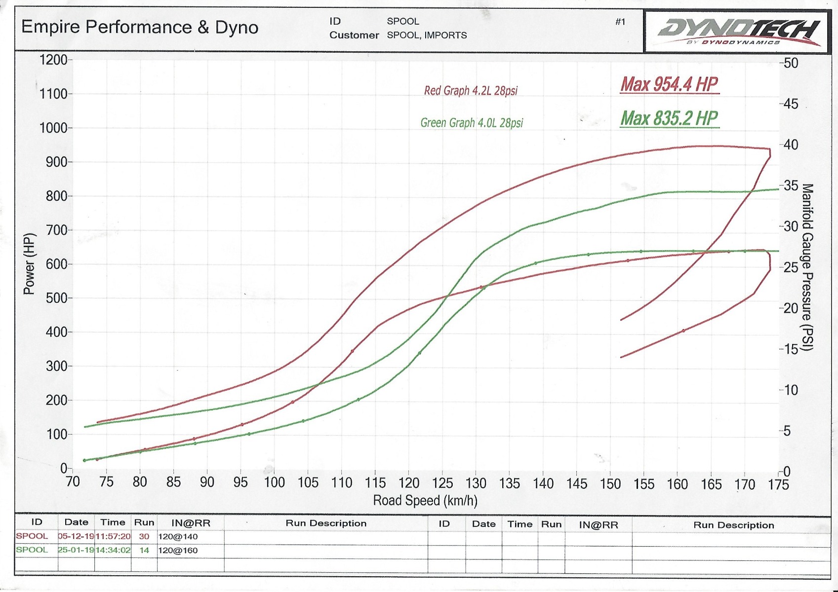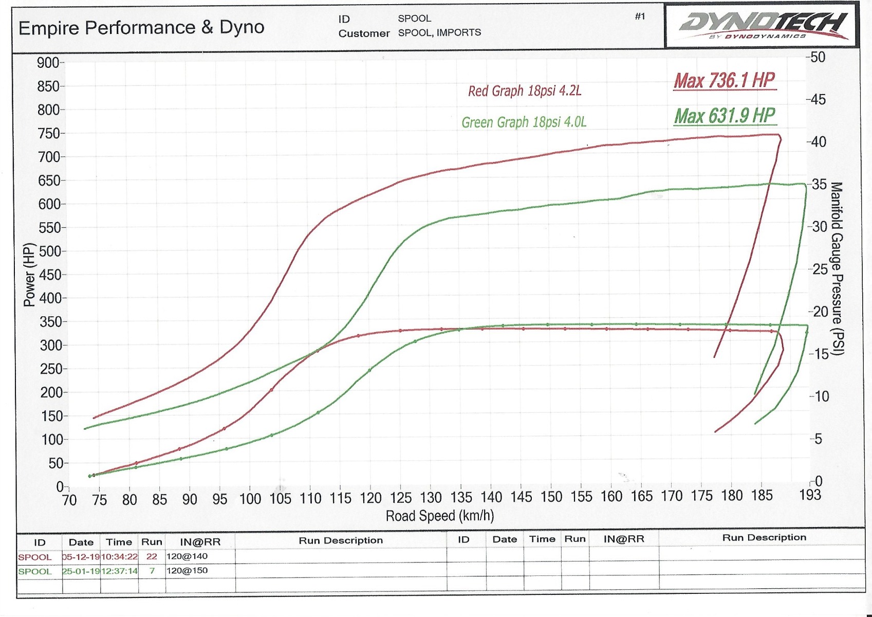 Remember folks, this is a “comparison” between the 4.0L and the 4.2L at the same boost levels. It’s not about just another Barra making 950 rwhp.
