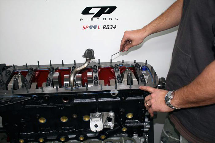Oil restrictors are fitted to the block to prevent over oiling - a common problem with RB engines.