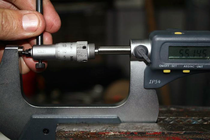 Crankshaft main journal is measured to ascertain bearing clearance.